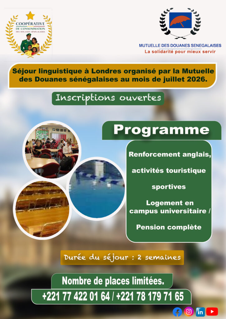 Dans le cadre de ses missions sociales et éducatives, la Mutuelle des Douanes sénégalaises organise un programme institutionnel de formation linguistique à l’international, prévu à Londres en juillet 2026.